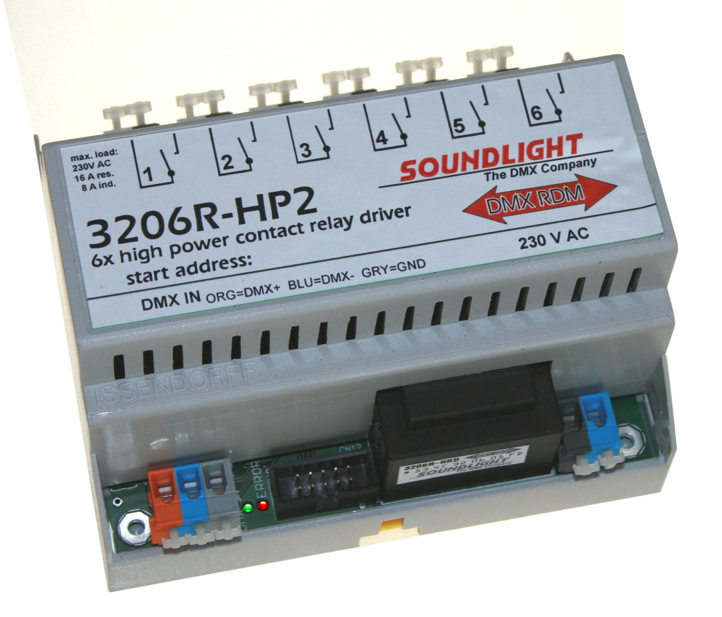 High-Power DMX Relais für Schaltanlagen Unsere DMX Relaiskarten arbeiten so zuverlässig, dass sie zunehmend auch von OEM-Partnern in Schaltanlagen verbaut werden. Wir haben dem Rechnung getragen und eine Version der 3206R-H herausgebracht, die mit speziellen Hochlastrelais mit extra hohem Einschaltstrom-Handling bestückt ist. So können ein Dauerstrom von 16A und ein Einschaltstrom von 80A bewältigt werden. | ![]() |