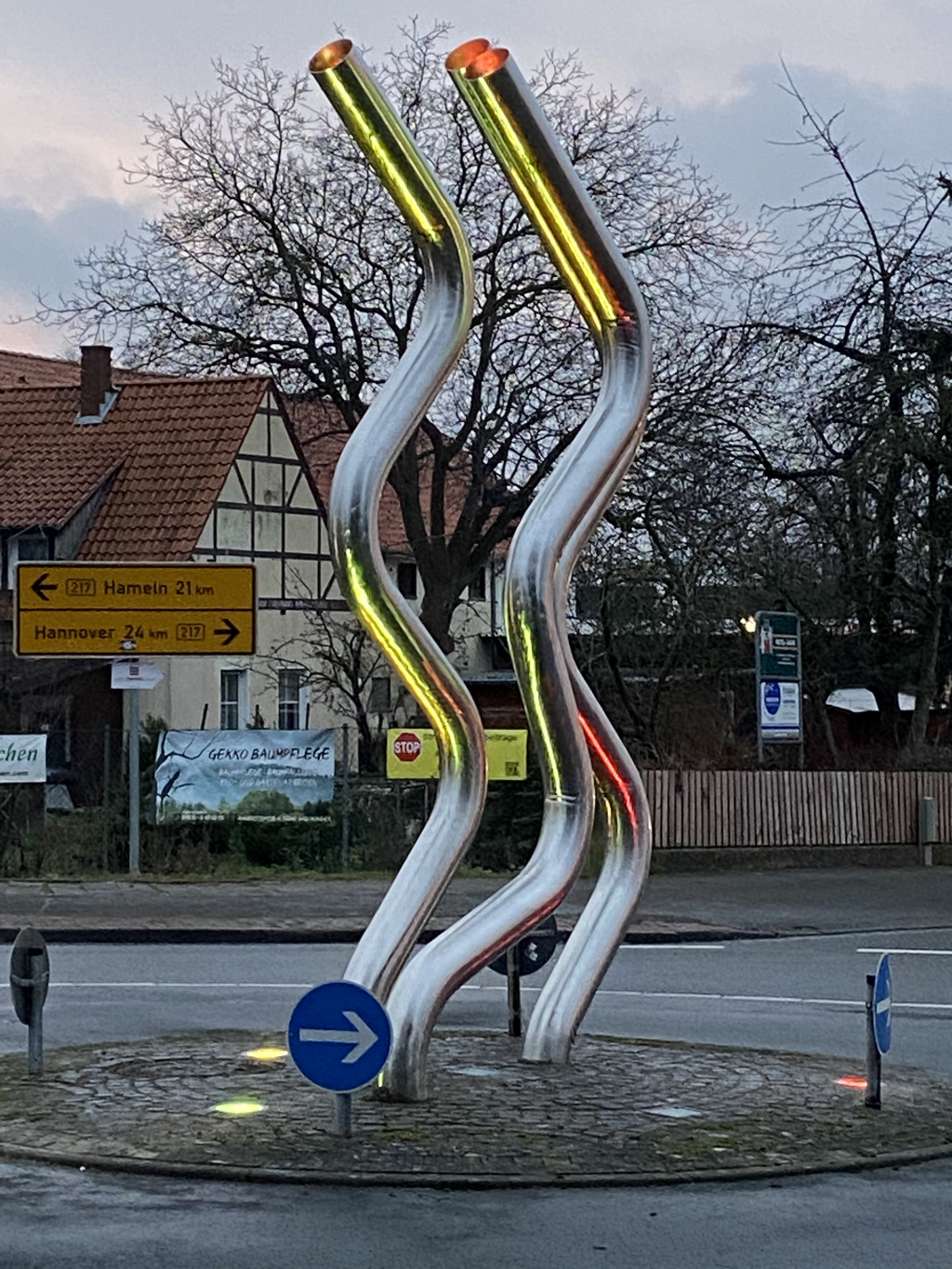 Haller, Haller, Haller Gemeint sind damit die drei gebogenen Stelen, die der Springer Künstler, Schmied und Edelstahl-Verbieger Andreas Rimkus für den Kreisel im Ortseingang des Städtchens geschaffen hat. Nach ein paar unbeleuchteten Jahren erstrahlen diese jetzt ab sofort tageszeitabhängig dank einer SOUNDLIGHT Stand-Alone-Steuerung in traumhaft schönen, dynamischen Farblichtwechseln. Aber bitte nicht am Lenkrad träumen: manchmal ist nämlich im Kreisel mehr Verkehr als gerade hier auf unserem Foto. Gepowert mit SOUNDLIGHT DMX Stand-Alone-Interfaces zur Ansteuerung der LED-Bodenleuchten. Technische Umsetzung und Betreuung: Stadt Springe und RANDY LIGHT Randolf "Randy"¯ Germer, Bad Nenndorf |