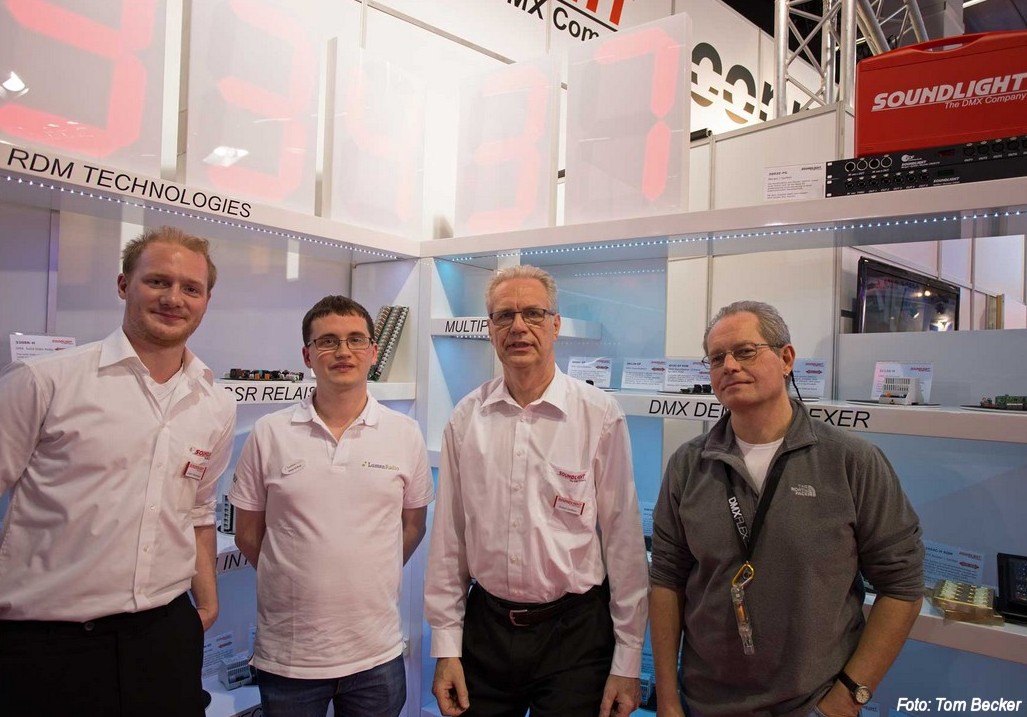 Growing Business Synergie-Effekte durch Gemeinsamkeit: SOUNDLIGHT, LUMEN RADIO und ARTISTIC LICENCE bündeln die Kräfte durch gemeinsames Auftreten und gebündelten Support für DMX RDM kompatible Produkte. Die drei Pioniere zeigen das problemlose Zusammenspiel ihrer Technologien. Ab sofort sind ARTISTIC LICENCE Produkte in Deutschland durch SOUNDLIGHT repräsentiert. Alle wichtigen Produkte werden lagermäßig bevorratet. Bild (von links): Julian wedemeyer (SOUNDLIGHT), Peter Kirkup (LUMEN RADIO), Eckart Steffens (SOUNDLIGHT), Wayne Howell (ARTISTIC LICENCE) | ![]() |