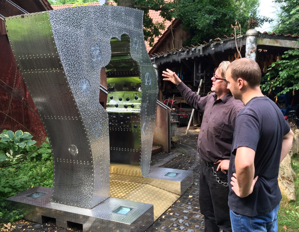 Eisen verleiht meiner Fantasie Flügel sagt Andreas Rimkus (l), der hier SOUNDLIGHT-Mitarbeiter Leonard Visser (r) ein von ihm geschaffenes Werk erläutert, das alle wichtigen, auf unserem Globus anzutreffenden Religionen zusammenfaßt und erläutert. Im Inneren geht es eher technisch zu: dort arbeiten SOUNDLIGHT Stand-Alone Interfaces, um die Effekte und Animationen zu verwalten und abzufahren. Technische Realisation: Andreas Rimkus (www.ideenkunst.de) | ![]() |