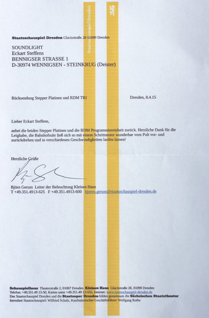 In Dresden gehen die Uhren anders Manchmal läuft die Zeit einfach schneller. Den "Time Warp" erzeugt man am Schauspiel Dresden elektronisch - hier wird die Uhr über unseren Stepper Motor Treiber 3904S-EP mal eben auf Touren gebracht. Vielen Dank für das nette Dankschreiben aus dem Theater! Einen ganz ähnlichen "Zeitsprung" erlebt der Zuschauer übrigens auch im Hamburger "Wunder von Bern": auch dort wird die Bahnhofsuhr von einer SOUNDLIGHT Steppermotor-Treiberkarte 3904S-EP per DMX auf die jeweils "richtige" Zeit gesteuert. Unsere Fertigung prüft gerade, ob sie nach Omega, Rolex und Apple nun auch in das Uhren-Geschäft einsteigen möchte... der Bedarf an flexibler Zeit scheint ja wohl gesichert! | ![]() |