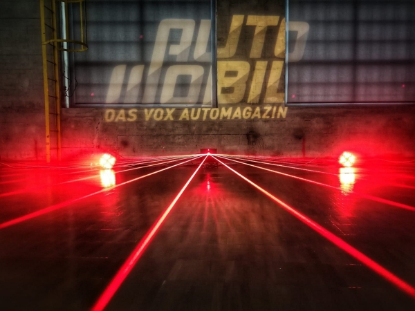 Ruhe! Aufnahme! Die Auffahrt eines Automobils wird mit LED und Laser dynamisch in Szene gesetzt, und so kann die Aufnahme starten. Der Kameramann ist irritiert: tatsächlich völlige Ruhe. Kein Flackern in der Kamera. Wie das, wo sonst doch immer Probleme mit dem LED-Licht an der Tagesordnung sind? Nun, er wußte nicht, dass der verantworliche Lichttechniker ganz einfach SOUNDLIGHT DC LED Driver 5004 benutzt hat... da gibt es keine Intermodulation, keine Taktung, keine Schaltregler, und also auch keine Interferenzen in der Kamera oder im Fernsehbild...